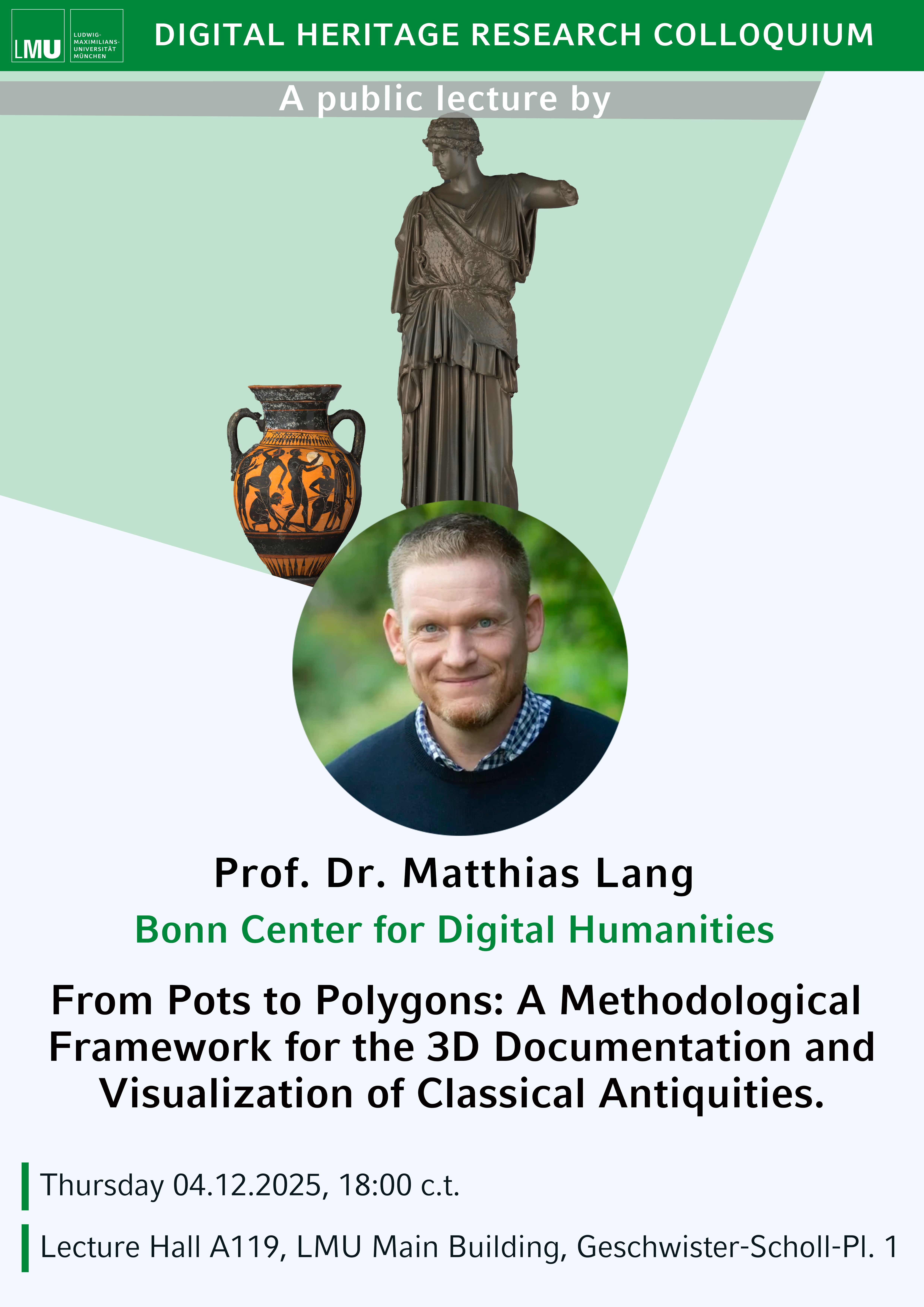 As part of the Digital Heritage Research Colloquium, Prof. Dr. Matthias Lang from Bonn Center for Digital Humanities will present a lecture titled “From Pots to Polygons: A Methodological Framework for the 3D Documentation and Visualization of Classical Antiquities.”